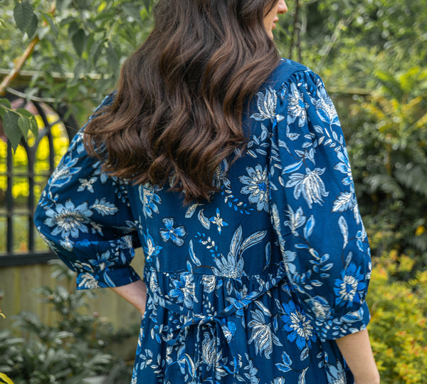 Blue Floral Dress | Manon Relaxed Fit Dress with 3/4 Sleeves & Gathered Skirt